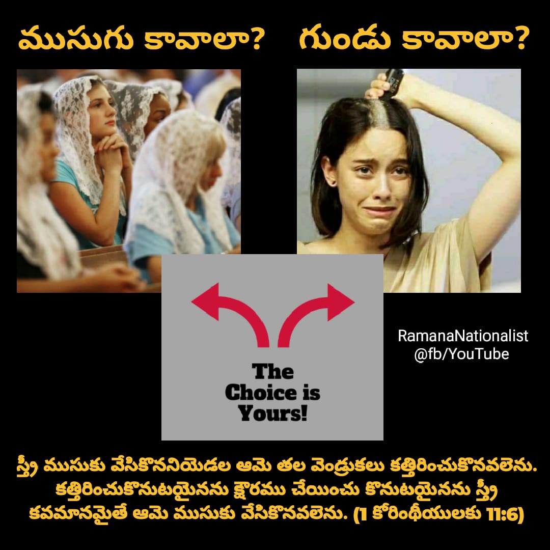స్త్రీ ముసుకు వేసికొననియెడల ఆమె తల వెండ్రుకలు కత్తిరించుకొనవలెను. కత్తిరించుకొనుటయైనను క్షౌరము చేయించు కొనుటయైనను స్త్రీ కవమానమైతే ఆమె ముసుకు వేసికొనవలెను. (1 కోరింథీయులకు 11:6)