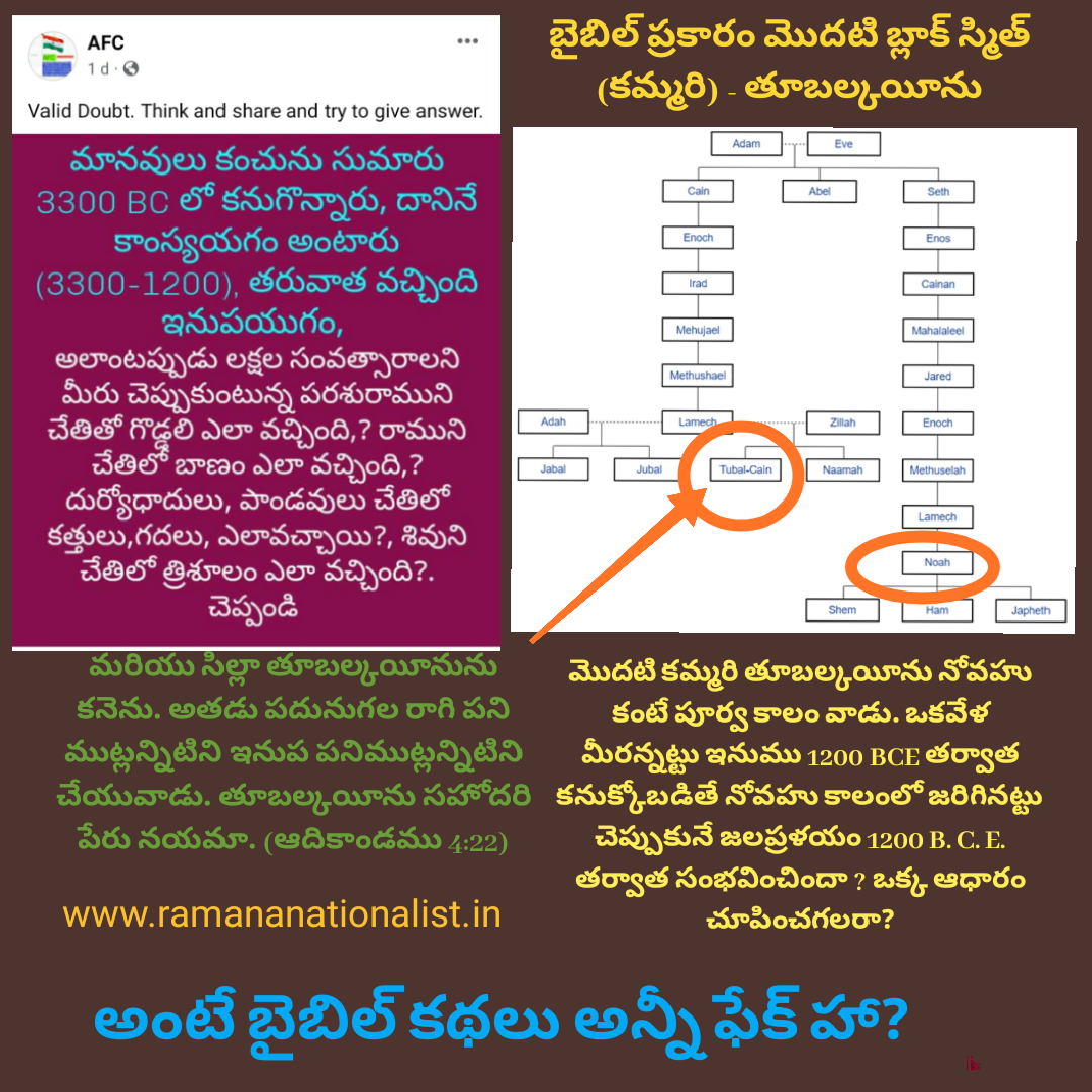 తూబల్కయీను 3300-1200 BCE కాలం వాడు అయితే అతని కంటే లేటుగా పుట్టిన నోవహు ఏ కాలం వాడు? 1200BCE తర్వాతనే కదా !
