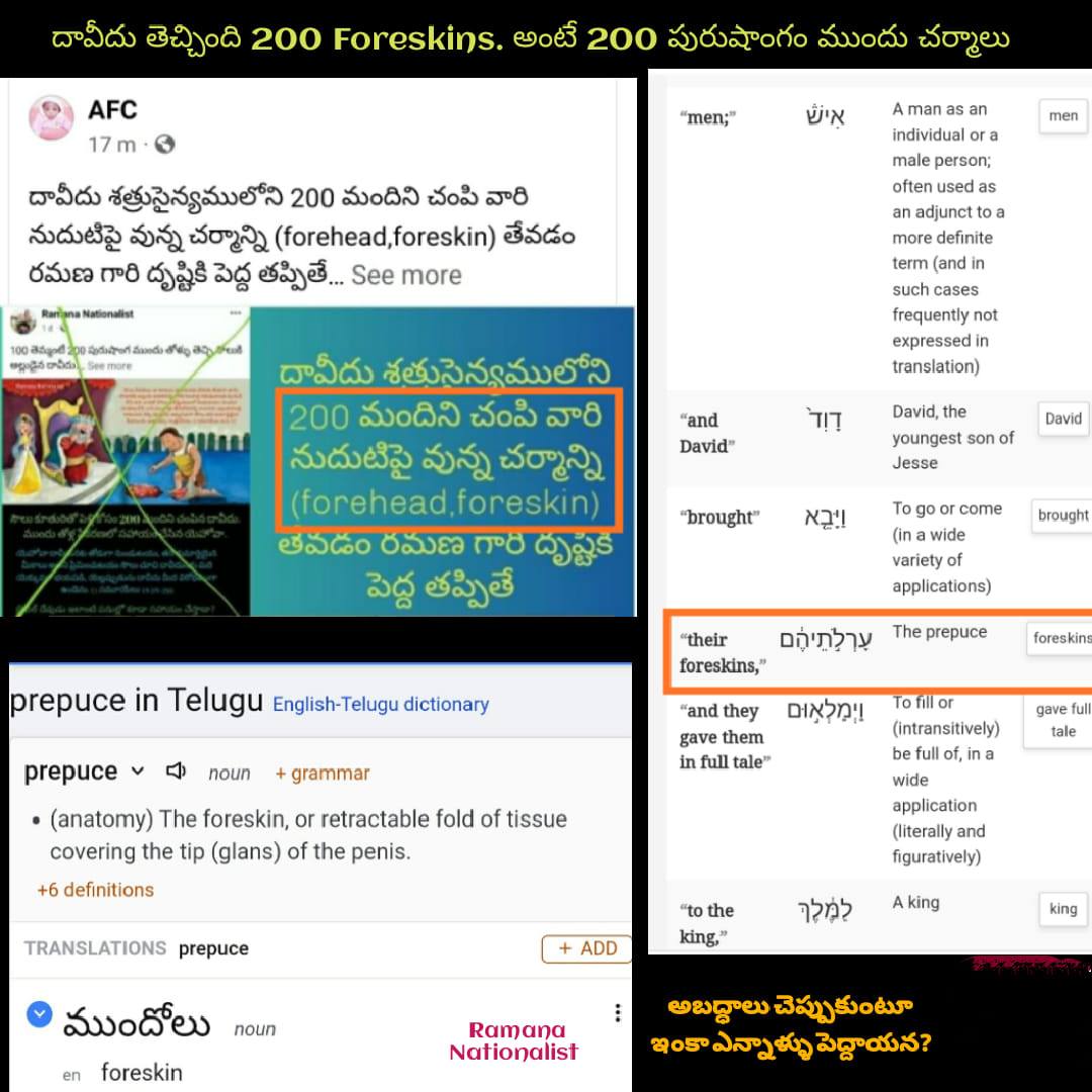 ఇక్కడ దావీదు తెచ్చిన ముందోళ్లు ( foreskins / prepuse ) అంటే glans penis యొక్క skin.