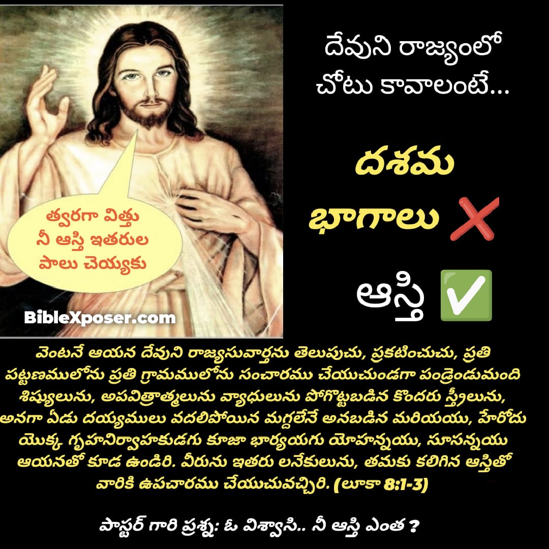 ఇక్కడ యేసు మరియు అతని అనుచరులు దేవుని రాజ్యం పేరుతో ఆస్థి కూడా తీసుకున్నారు అని రాసి ఉంది. దశమ భాగాల కంటే ఆస్తి ఎక్కువ విలువైనది కదా!