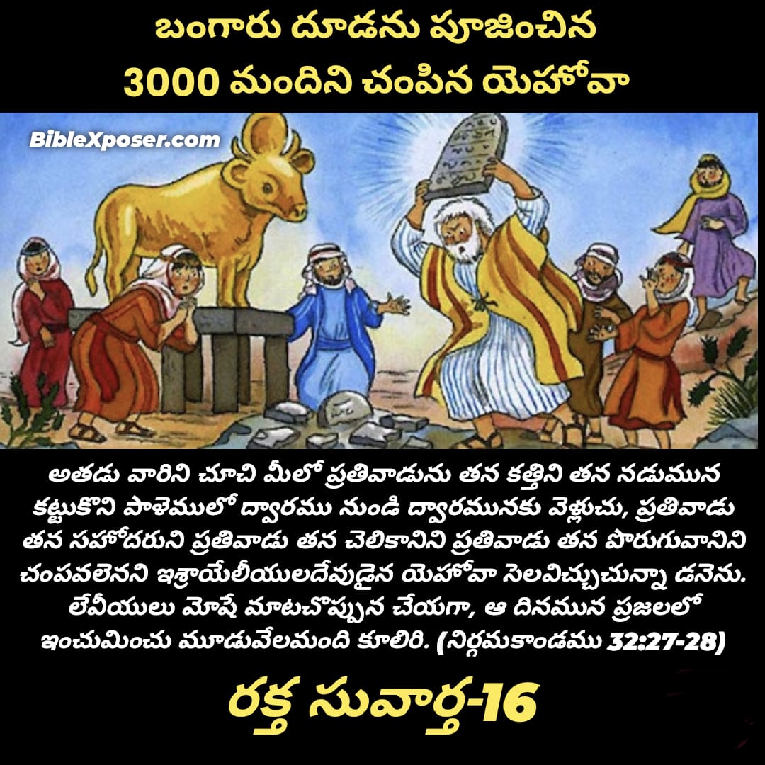• క్రూరమైన ఆజ్ఞ: మోషే ద్వారా ఇశ్రాయేలీయుల దేవుడు ఇలా ఆజ్ఞాపించాడు: “ప్రతివాడు తన కత్తిని నడుమునకు కట్టుకొని, పాళెములో ద్వారము నుండి ద్వారమునకు పోయి, ప్రతివాడు తన సహోదరుని, తన స్నేహితుని, తన పొరుగువాని చంపువలెను.” (నిర్గమకాండము 32:27)
