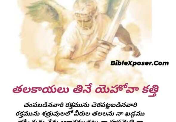 వినడానికి వింతగా అనిపించినా ఇదే నిజం. బైబిల్లో లిఖించబడిన సత్యమిదే. యెహోవా యొక్క కత్తి మనుషుల తలకాయలు తింటుంది. వారి నెత్తురు తాగుతుంది. ఆ మాట కూడా ఆయనే చెబుతున్నాడు. చంపబడినవారి రక్తమును చెరపట్టబడినవారి రక్తమును శత్రువులలో వీరుల తలలను నా … Continue reading రక్త సువార్త-3