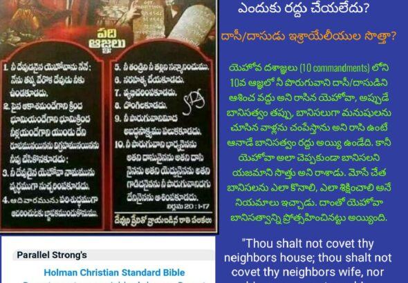 బానిసత్వాన్ని యెహోవా ప్రోత్సహించాడా? బానిసత్వాన్ని యెహోవా/మోసే ఎందుకు నిషేదించలేదు. ఈ ప్రశ్నలకు సమాధానం తెలిస్తేనే మనకు బైబిల్లోని బానిసత్వం గురించి … Continue reading బైబిల్లో బానిసత్వం -1