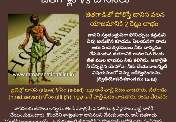 జీతం తీసుకునే దాసుడు Vs కొనబడిన బానిస బైబిల్లో వెట్టి చాకిరీ చేసే బానిసలతో పాటు జీతం కోసం పనిచేసే దాసులు కూడా ఉంటారు. వీరికి ఎప్పటికప్పుడు జీతాలు అందుతాయి. ఇజ్రాయెల్ వారిని బానిసలుగా కొన్నప్పుడు ఇజ్రాయెల్ వాడైన యజమాని తన … Continue reading బైబిల్లో బానిసత్వం -9