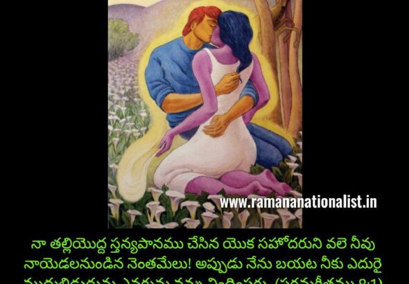 శృంగారగీతాలాపన -5 (పరమగీతం వివరణ) సోలమన్ రచించిన పరమగీతంలో ఒక చోట కావ్యనాయకి తన ప్రియుడితో ఇలా అంటుంది. నా తల్లియొద్ద స్తన్యపానము చేసిన యొక సహోదరుని వలె నీవు నాయెడలనుండిన నెంతమేలు! అప్పుడు నేను బయట నీకు ఎదురై ముద్దులిడుదును … Continue reading అన్నా చెల్లెళ్ళ ముద్దులాట